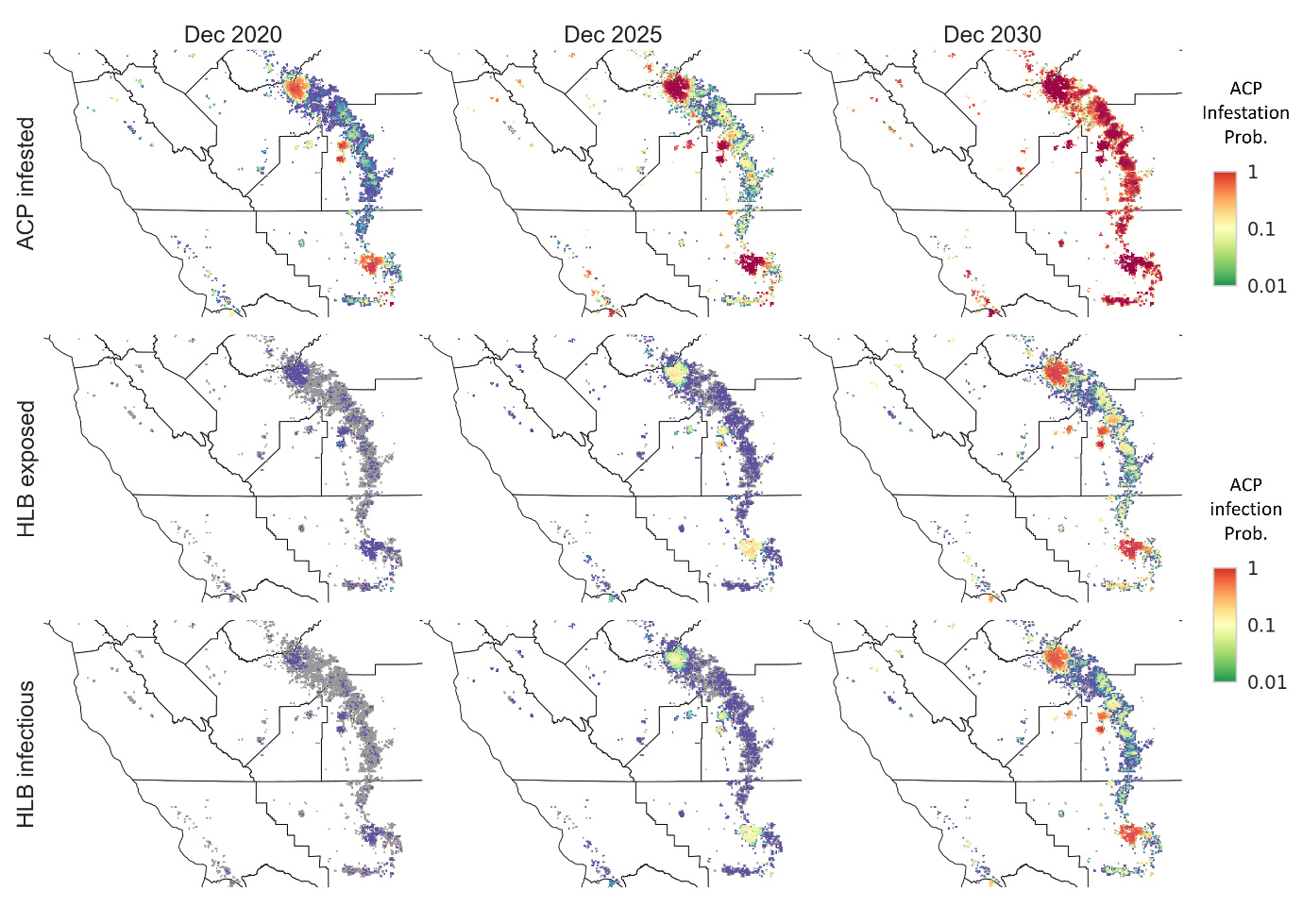 Figure above shows distribution maps predicting the potential spread of both insect vector (Asian citrus psyllid) and Huanglongbing disease (citrus greening) moving across the Central Valley, up to 2030. These assumptions are made using transferable parameters from Texas and adjusting for climatic conditions in the Central Valley region.