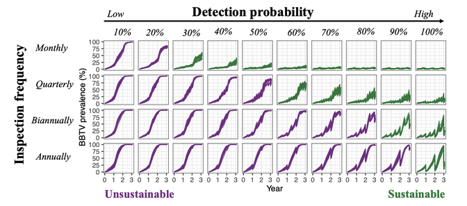 Running generated simulations we can provide evidence that introducing virus-free material in areas affected by BBTV along with propagation of suckers combined with plant inspection for infection and removal of infected plants can provide a sustainable strategy for disease management.