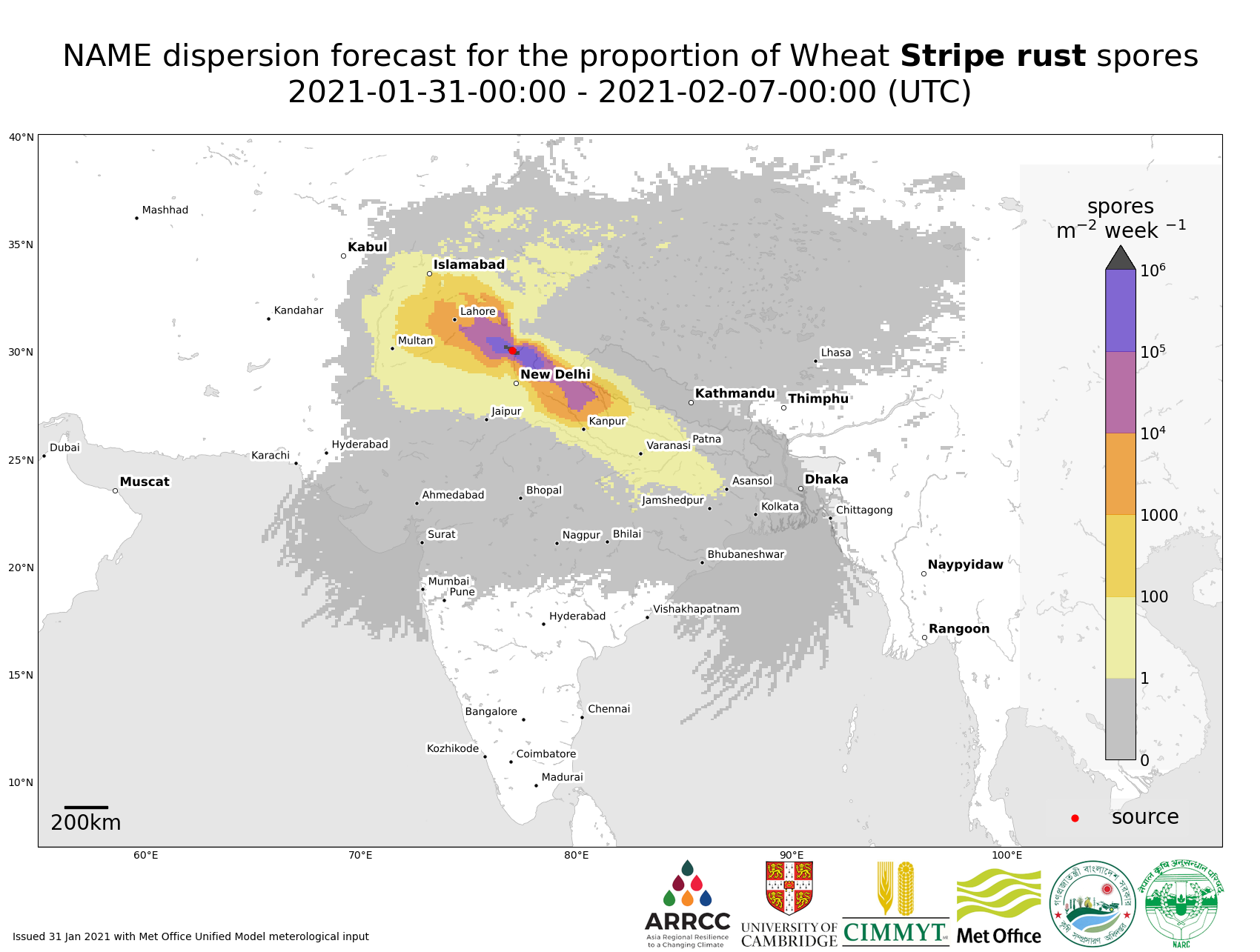 As a result of the relentless efforts of many collaborating organisations (University of Cambridge, Met Office, CIMMYT, EIAR and ATA), an Early Warning System has been established to provide a daily near-real time weeklong forecast of the spread of stem (Puccinia graminis), stripe (Puccinia striiformis), and leaf (Puccinia triticina) rust in Ethiopia. The system has recently been extended to include Kenya in East Africa and Nepal and Bangladesh in South Asia (the latter in collaboration with CIMMYT-Bangladesh, NARC, BWMRI, DHM, DAE, and EMBRAPA).